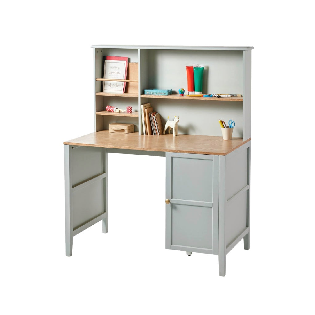 - Color: Blanco/gris claro con tablero color madera natural.